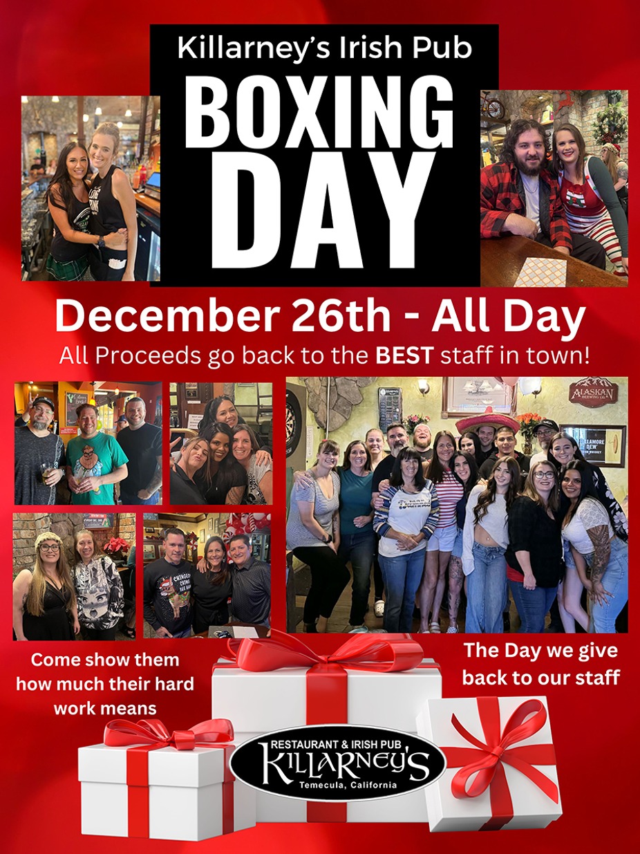 Friday December 26th is annual Boxing Day. This is the day we give back to our staff. All proceeds will go back to our hard working staff to show them how much we appreciate them. So come in, eat, drink and show your appreciation to the best staff in town!